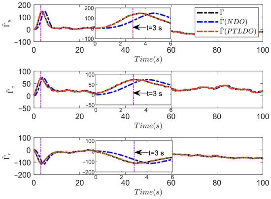 The estimated values of lumped disturbances under NDO and PTLDO.