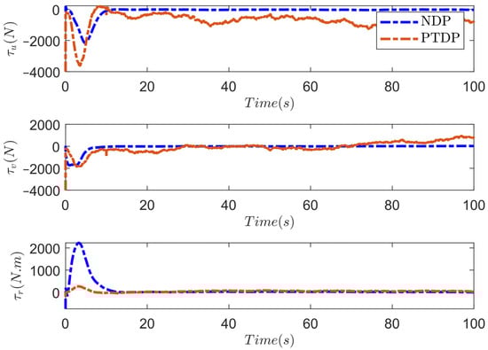 Evolution of control inputs under NDP and PTDP schemes.