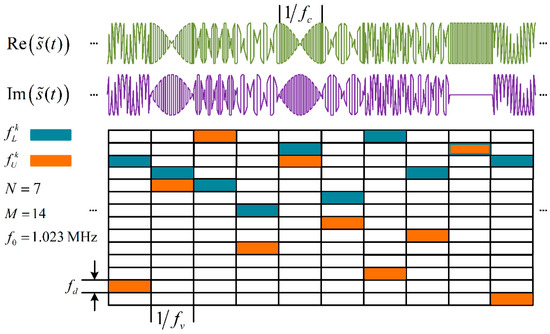 where = max, = min, for all [, ], [, ], where is the reference frequency, equal to 1.023 MHz by default; and represent the number of frequencies of the lower and upper sidebands, respectively; = , [, ], with denoting the minimum frequency-hopping interval; = , with indicating the rate of the spreading code chip. The frequency-hopping rate is denoted as , which is assumed to be equal to but is also allowed to be slower than . Figure 1 displays both the real and imaginary components of an example signal, IFH-BOC ([14, 1, 8; 14, 1, 1], [1, 1]), demonstrating how the signal waves vary as the frequency-hopping patterns shift.