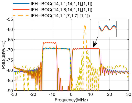 The ACF and PSD define the time–frequency characteristics of GNSS signals. The ACF and PSD can be derived for this modulation under the assumption of an ideal spreading code for IFH-BOC. The normalized PSD for IFH-BOC can be found in Appendix A, where it is presented as follows: