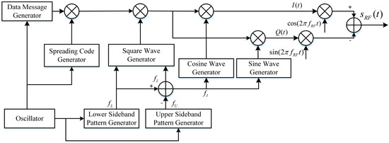 where denotes the spreading code chip modulated with data, and represents a rectangular pulse of duration ; and represent the frequencies of the lower and upper sidebands of , respectively. By letting = − , (1) can be expressed as: