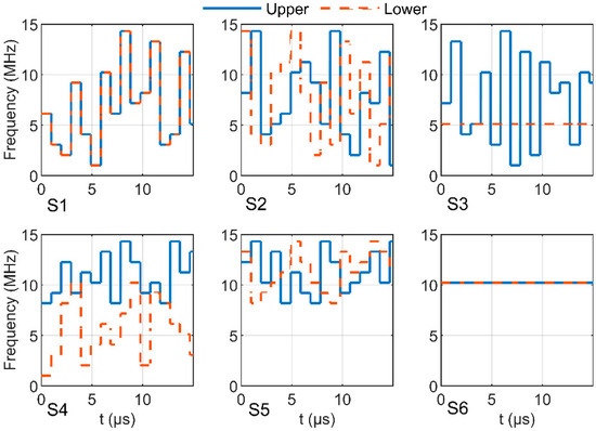 This section examines the performance of IFH-BOC modulation relative to FH-BOC and BOC modulations. The selected signals, labeled S1–S6, are detailed in Table 1. S1 represents an FH-BOC signal, while S6 refers to BOC(10,5), the military signal used on GPS carriers L1 and L2 [3]. S2–S5 comprise various typical IFH-BOC signals. Figure 7 illustrates the frequency-hopping patterns of these selected signals, revealing that S1 and S6 share the same patterns for their lower and upper sidebands, whereas S2–S5 exhibit distinct patterns.