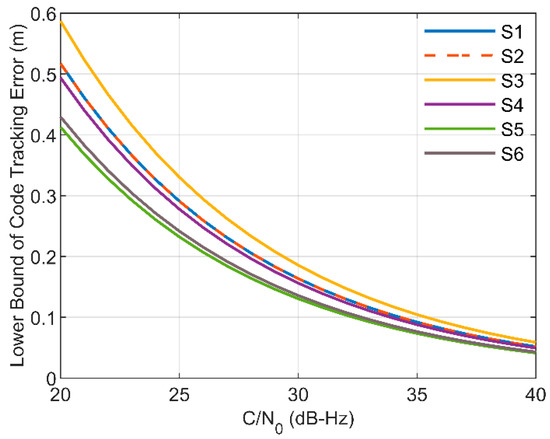 Here, represents the equivalent rectangular bandwidth of the tracking loop, denotes the carrier-to-noise density ratio, and indicates the integration time [24]. The integral terms in (13) and (14) indicate that the high-frequency components of the signal have a significant impact on the code tracking accuracy. Increasing the high-frequency power of the signal can improve the code tracking accuracy. The code tracking accuracy for IFH-BOC signals can be improved by increasing or , where [, ], and [, ]. Increasing can also achieve this, but requires a wider signal bandwidth. Table 1 lists , , and for the selected signals S1~S6. For a of 1 Hz, a of 1 ms, and a of 40 MHz, Figure 11 illustrates the lower bounds of the code tracking errors for the selected signals. Among these, S5 exhibits the smallest lower bound, while S3 has the largest. The lower bounds for S1 and S2 are marginally less than that of S3, and the lower bound for S4 is less than those for S1 and S2, yet greater than that of S6.