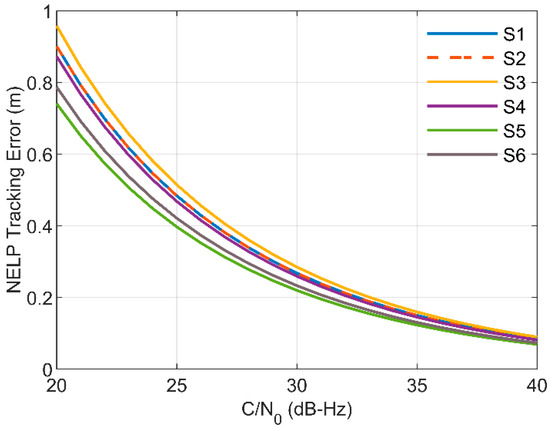The signal modulation scheme primarily dictates the maximum accuracy of code tracking. In this subsection, we will evaluate the tracking performance of the selected signals.