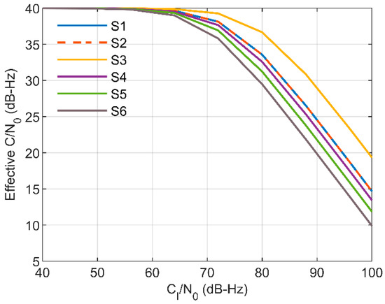 where represents the front-end bandwidth of the receiver, denotes the PSD of the band-limited signal, and signifies the normalized PSD [24]. An increase in correlates with a decrease in the bound of the code tracking error. Figure 10 illustrates for various example signals. When is set at 30 MHz, signal S5 exhibits the largest among the examples, whereas S3 displays the smallest. Both S1 and S2 share the same , while S4’s is less than that of S6 but greater than those of S1 and S2.