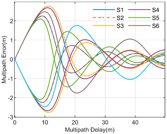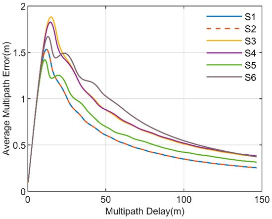 In a scenario with one direct path and one reflected path, where is −6 dB, early-late spacings of 32 ns for S1 and S2, 40 ns for S3, 28 ns for S4, and 22 ns for S5 and S6 are utilized, along with a of 40 MHz. Figure 15 and Figure 16 illustrate the multipath error envelopes against the multipath delay and the average multipath error envelopes for the selected signals, respectively. When the multipath delay is under 15 m, the error envelopes for S5 are the smallest, while S3 exhibits the largest. The error envelopes for S6 are greater than those for S1 and S2 but smaller than those for S4. The average multipath error envelopes for S1 and S2 are the lowest, whereas S6 has the highest. The average multipath error envelope for S4 closely aligns with that of S3.