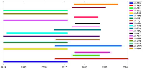 Figure 1 provides an overview of the temporal coverage of VLF amplitude data for each path, spanning a nearly six-year period from January 2014 until mid-February 2020. Each horizontal bar in Figure 1 corresponds to a path and shows the time period of the available “raw” (i.e., before any check or processing) VLF amplitude data for the specific path.