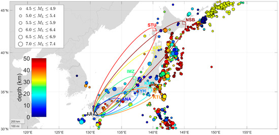 Map of the wider area around Japan showing the 11 subionospheric propagation paths of the Hi-SEM VLF network and EQs with and depth ≤ 50 km that occurred during the time period of interest. (Figure format is the same as that of Figure 2).