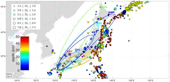Map of the wider area around Japan showing the 8 subionospheric propagation paths of the EAL VLF network. Each VLF receiver is presented with a square and a different color, and the JJI transmitter is portrayed as a black triangle. Each 5th Fresnel zone is also illustrated. EQs with and depth ≤ 50 km that occurred during the time period of interest are indicated as circles. The size of the circle and its scaled (represented by a color bar) color represent the magnitude and the depth of the EQ, respectively.