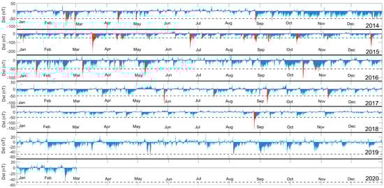 Dst index from January 2014 until February 2020. Each panel’s x-axis corresponds to a full year, from 2014 (top panel) to 2020 (bottom panel). The red-colored parts indicate values lower than the −50 nT threshold (shown as a horizontal dashed line in each panel).