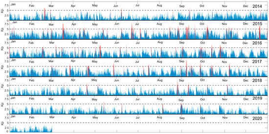 Kp index from January 2014 until February 2020. Each panel’s x-axis corresponds to a full year, from 2014 (top panel) to 2020 (bottom panel). The red-colored parts indicate values higher than the threshold 5 (shown as a horizontal dashed line in each panel).