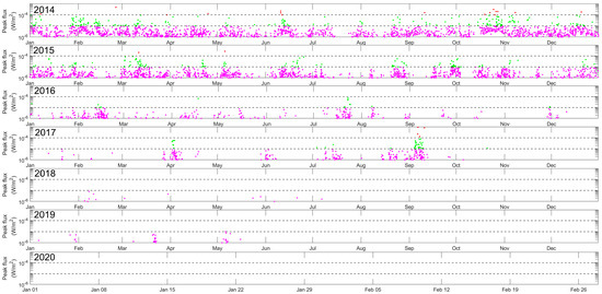 Solar flares from January 2014 until February 2020. Magenta, green, and red points indicate C-, M-, and X-class solar flares, respectively.