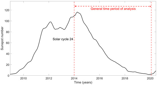 Regarding solar activity, the occurrence of C-, M-, and X-class flares has been obtained from the Institute of Space and Astronautical Science/Japan Aerospace Exploration Agency (ISAS/JAXA) and the Institute for Space-Earth Environmental Research (ISEE) (https://hinode.isee.nagoya-u.ac.jp/flare_catalogue/) (accessed on 10 October 2024) of Nagoya University. Solar flares during the time period of interest are depicted in Figure 6. However, in order to have a synoptic depiction of solar activity during the period of interest, we have also acquired the 13-month smoothed sunspot number from the World Data Center of Sunspot Index and Long-Term Solar Observations (WDC-SILSO) (https://www.sidc.be/SILSO/datafiles#total) (accessed on 10 October 2024) of the Royal Observatory of Belgium. For this purpose, we present the temporal variation in sunspot number during the solar cycle 24 in Figure 7. The part of the solar cycle 24 delimited by the two red dashed vertical lines indicates the time period of interest for all paths. It is clear that at the beginning of the period under investigation, the sunspot number almost reaches its maximum, and after that, it monotonically decreases to its minimum just before the end of the studied period. In Figure 6, it is observed that the number of solar flares is higher at the beginning of the studied time period and gradually decreases at the end, in agreement with the sunspot number temporal variation shown in Figure 7.