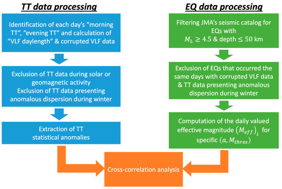 In this study, we present a six-year (2014–2020) statistical analysis of VLF subionospheric propagation data at 19 VLF receivers from the VLF transmitter with call name JJI and frequency 22.2 kHz, all located in Japan. Moderate and strong earthquakes (EQs) ( and depth ≤ 50 km) that occurred in the wider area around Japan during the same time period with the available VLF data are investigated. The terminator times’ (TT) shift in VLF amplitude data as a possible precursor of an EQ are statistically examined, focusing on the correlation with seismic activity. The concept of the effective EQ magnitude ( is used in order to define the total EQ energy possibly affecting the midpoint of each path for each day. It is important to note that dates when geomagnetic storms or solar flares occurred as well as dates corresponding to the already known winter effect on TT statistics in the north–south direction were excluded. The cross-correlation between TT statistical anomalies and seismic activity, represented by , was extracted. Maximum cross-correlation values were found for most of the cases prior to the subsequent seismic activity, indicating a link between the ionospheric anomalies and the subsequent seismicity. Finally, the wide temporal range of the cross-correlation maxima temporal locations is justified by the inhomogeneity of the lower ionosphere, coupled with the anisotropy of the preseismic effect of the impending seismicity, highlighting the complexity of the EQ preparation processes.