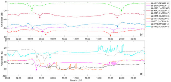 Stacked signals of 24-h VLF amplitude recordings smoothed by a Gaussian filter and shifted by 10 dB; arrows indicate the temporal location of TT minima (their color is the same as the corresponding signal’s color). (a) Examples of five path cases for which the temporal location of both the morning TT and evening TT minima was unquestionably identified. (b) Examples of five path cases for which the temporal location of either the morning TT, evening TT, or both TT minima was impossible to identify due to a corrupted signal.