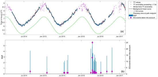 As an example of the TT data used in our analysis, Figure 10 presents the morning TT of the JJI-ANA path and the corresponding seismicity. In Figure 10a, the background mean curve (black solid thick curve) and the (black dashed thin curves) are presented together with the TT data (dots). The sunrise time, calculated at the midpoint of the path (green solid thick curve), is also provided for comparison with TT seasonal variation. Anomalies exceeding the curves are denoted with red dots, whereas the winter anomalous fluctuations, excluded from our analysis (see Section 3.1), are denoted with purple dots. It is noted that, apart from the winter anomalous fluctuations that are included in Figure 10a to highlight the specific phenomenon, all other TT values that have been excluded from the analysis for different reasons (see Section 3.1) are omitted from this figure. In Figure 10b, the time series for this specific path and VLF parameter and for the combination is shown (blue bars) together with the total EQs of each day taken into account for the calculation of daily values (magenta rhombuses) for visual comparison with the statistical TT anomalies (red dots). We note that the time series values corresponding to time periods of excluded TT data are also omitted from Figure 10b since these are excluded from the analysis, as mentioned in Section 3.2.