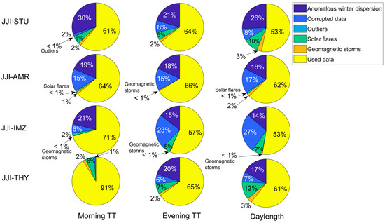 The statistics of the available TT data for four indicative paths are shown in Figure 11. Specifically, Figure 11 concerns the three analyzed parameters (VLF morning TT, evening TT, and VLF daylength) for each of the paths JJI-STU, JJI-AMR, JJI-IMZ, and JJI-THY. It shows, as a percentage, what part of the total coverage days of each path corresponds to the final used data and different classes of excluded data. Data were excluded because the signal was completely or partially corrupted, indicated as “corrupted data”, due to TT overlap in time with solar flares or geomagnetic storms, indicated as “solar flares” and “geomagnetic storms”, respectively, and due to the mentioned path-direction-dependent phenomenon of unusually high statistical dispersion of TTs during winter, indicated as “anomalous winter dispersion”. Note that missing days of recordings were also included in the “corrupted” data class.