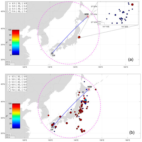 Map of the area around Japan, with the path length of JJI-NSB, shown as the blue great-cycle distance between the transmitter JJI (black triangle) and the receiver NSB (red square), a circular area (bounded by the magenta dashed periphery) of radius (i.e., for ) around the midpoint of the path. (a) Seismicity of 22/11/2016 within the circular area that was taken into account for calculating that day’s effective magnitude value , with the contribution of each EQ event to the effective energy of the specific day color-coded. (b) Same as (a), but for the seismicity within the circular area that led to daily effective magnitude values for the whole time period that clean morning TT data were available for the specific path (1 January 2014 to 28 February 2017, except days excluded during dataset clean up).