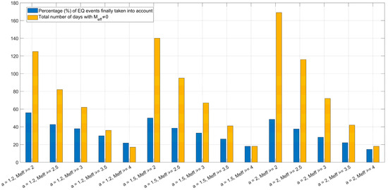 An example of the seismicity statistics for each of the considered combinations is presented for the JJI-NSB path and the VLF parameter of the morning TT in Figure 13. It shows the total number of days for which the values calculated for the circular area were non-zero (light orange bars), as well as the percentage (%) of the EQ events within the circular area that were finally taken into account after applying threshold filtering (blue bars). The profound trend as increases is the decrease in both, which is reasonable. Moreover, one can observe that the percentage of the EQ events taken into account slightly decreases, while the total number of days with increases as the multiplier value increases for the same .