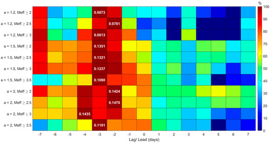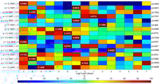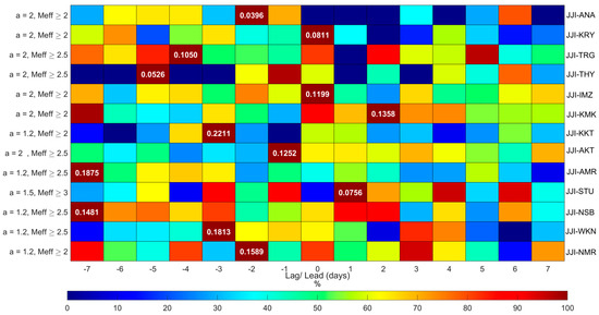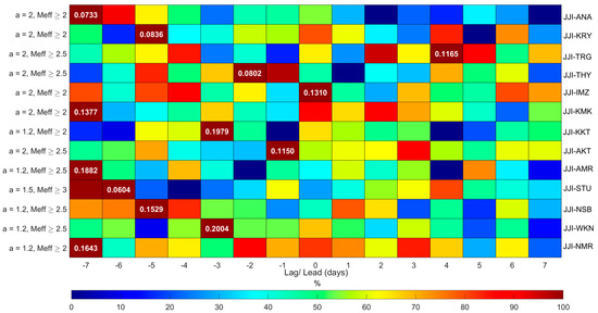 As an example of the results obtained for a single path and one of the three studied VLF parameters, Figure 14 presents the cross-correlation results for the morning TT of the JJI-KTU path, where only some of the possible combinations are presented due to the exception from our analysis of the cases for which the total number of days of non-zero values were below 15 (as already explained). The vertical axis of the figure shows the combinations, while the horizontal axis indicates the cross-correlation lag/lead days. The maximum cross-correlation value in each row (i.e., each combination) is indicated with a deep red color (100% of the color scale) and the maximum value label, whereas the rest of the cross-correlation values on the same row appear color-coded as a percentage of the maximum value of the row. Thus, the color coding is normalized per combination.