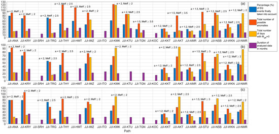 Finally, in Figure 18, we present the summary statistics of the seismicity and the VLF data used in the analysis results presented in Figure 15, Figure 16 and Figure 17. Figure 18a–c present the results for each VLF parameter of the morning TT, evening TT, and VLF daylength, respectively. For each path and the combination chosen for each VLF parameter, four bars summarize the corresponding statistics. Light orange bars show the total number of days for which values calculated for the chosen circular area were non-zero, whereas blue bars indicate the percentage (%) of the EQ events within the circular area that were taken into account after applying threshold filtering. Orange bars show the total number of possible anomalies (exceeding the threshold), and purple bars show the duration of analyzed (cleaned) data in months. Paths with only purple bars (i.e., for which blue, orange, and light orange bars are missing) are cases of paths (namely mentioned earlier) for which it was not possible to perform a statistical analysis due to the corrupted data or an insufficient number of days (<15 days) of non-zero . For these cases, we show only the duration of available data.