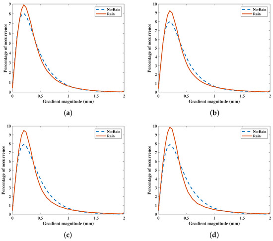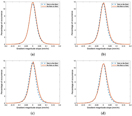 In these figures, the red curve represents the gradient values during rainy hours and the blue one denotes the same for converse weather conditions. It can be observed from the figure that the shift between the two curves is very small; the red curve almost overlaps the blue one. We illustrate the change in gradient magnitude during the transition of weather conditions across different area sizes. Figure 3a–d show continuous histogram plots for the rate of change in gradient magnitude for the same region in Southeast Asia across varying window sizes from 2° × 2° to 8° × 8°. The rate of change in gradient is calculated from the gradient magnitudes between two consecutive time epochs, each 6 h apart. A positive rate of change indicates an increase in gradient magnitude over time, while a negative rate of change implies a reduction in gradient values. Although there is a slight shift for smaller area sizes, the shift gradually reduces beyond 6° × 6° as we enhance the window size for our investigation. With the increase in area size, the two curves almost coincide, suggesting that gradient magnitude and its variation are not reliable indicators for predicting changes in weather conditions. When a rain event approaches a region, water vapor accumulates in the atmosphere of the surrounding area, which might increase the gradient magnitude even without the occurrence of a rainfall event, thereby making the area humid for an extended period. Therefore, we have also studied other features of the atmospheric gradient to understand its relationship with precipitation and explore its potential in nowcasting rainfall for a region in the tropical climate.