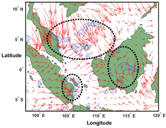 In previous work, we established a rainfall prediction model based on gradient magnitude, gradient slope, and atmospheric residual for an individual station [26]. In this section, we present the atmospheric gradient map for a region shown in Figure 4 to study the behavioral trend of the gradient during a weather event. The gradient map essentially represents the tropospheric gradient vector map, detailing its magnitude and direction. We display the gradient map for the region extending from 11°N to 7°S and 98°E to 120°E. The contour plot on the map indicates the precipitation for the corresponding region. From this figure, we can observe three significant rain events over the South China Sea (2°N to 6°N and 104°E to 109°E), Borneo island (2°N to 2°S and 111°E to 115°E), and the southeast coast of Sumatra Island (2°S to 5°S and 105°E to 107°E). In the gradient map, we plot the averaged vector sum of the atmospheric gradient at four neighboring grid points. It is evident from the figure that the atmospheric gradients surrounding the areas of precipitation are pointing toward those regions. Therefore, the weather front plot provides conclusive evidence of the converging nature of atmospheric gradients around the regions of precipitation. Also, a slightly larger gradient magnitude can be observed near the regions of precipitation.