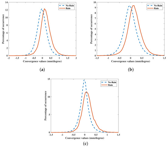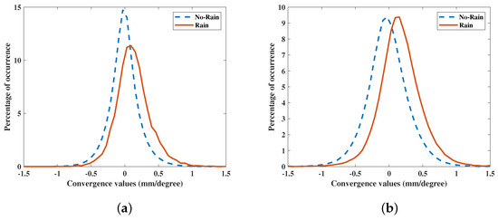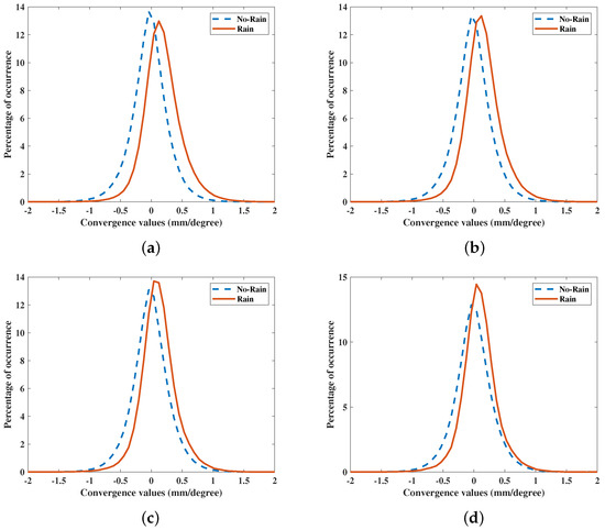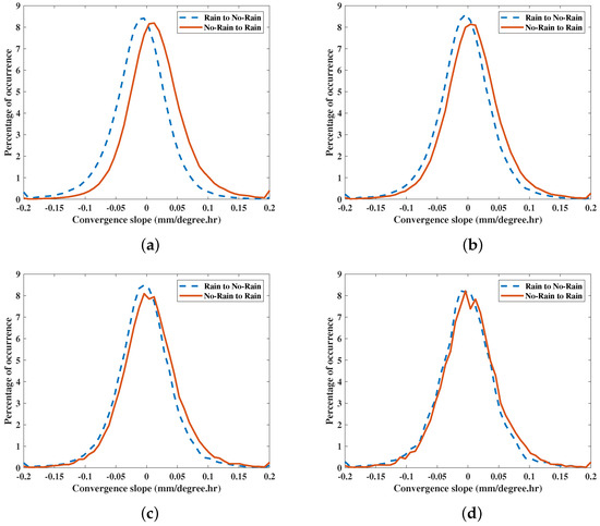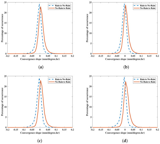 In this article, we used a certain condition to discriminate the rain-influenced region from the areas without precipitation. However, we slightly varied the precipitation condition and verified the results using additional rainfall criteria to validate our study. All criteria for defining a rainfall event over a region are listed in Table 2. Each condition is assigned one alphabet to identify the criterion in our subsequent discussion. Here, the plots for the rate of change of convergence are only presented in Figure 15a–d to allow a comparative analysis of four different conditions for considering a rain event’s impact on a region. The convergence rate of change over an area of 4° × 4° is evaluated as the rate of change per hour between two time epochs, 24 h apart, considering a gradual change in rainfall rate over the last day. The plots show that the shift between the two curves is consistent across all figures. The atmospheric gradient exhibits a greater rate of change in convergence during the transition from a no-rain period to a rain event compared to the reverse phenomenon. Both curves follow a similar trend with variations in rainfall criteria and show a slight change in the separation between values for the rate of change in convergence as weather conditions alter over a region. Henceforth, we can conclude that adjustments to the rainfall condition will not affect our analysis of the various features of the atmospheric gradient significantly, which has been vividly discussed in this article. The optimized criteria for rain events over an area can be established based on the efficiency of the rainfall forecasting algorithm, which is a potential direction for future research.