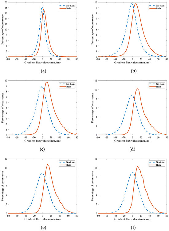 We have exhibited the continuous histogram plots for the flux of the atmospheric gradient in Figure 9a–f for different window sizes extending from 2° × 2° to 12° × 12° with one-year data for the tropical region in Southeast Asia. The blue curve symbolizes the gradient flux values for no-rain conditions whereas the red one signifies the same for rain events. It is visible from the plots that the red curve shifts right toward more positive values indicating the inward flux of the atmospheric gradient during rainfall. The left-shifted curve concludes that the gradient flux possesses negative values during the absence of rain events which in turn implies the outward nature of gradient flux. This observation is quite in line with the convergence of the gradient as the atmospheric gradient converges at the region of precipitation which corresponds to the inward flux of the gradient and vice-versa. With the increase in area size, the two curves shift away from each other, and the separation between the two curves increases, which provides the more evident feature for rainfall nowcasting for an area. We have shown the spatial dependence of gradient flux values up to 12° × 12° window size as the number of rain events beyond that is too small to be considered for the analysis. Therefore, we can infer from this analysis that, unlike gradient convergence, gradient flux is not a localized phenomenon, rather it can be used as a potential feature for a much larger region affected by heavy rainfall. Furthermore, precipitation corresponds to the rise in gradient flux values over an 8° × 8° area for more than 90% of cases, making the gradient flux a promising criterion for rainfall nowcasting. The inward flux of gradient surrounding the region of precipitation is highly imperative in the analysis of the weather front for a region.