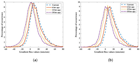 The temporal variability of atmospheric parameters is another imperative aspect of weather prediction that needs to be investigated rigorously for accurate weather forecasts in advance. In this section, we have studied the time evolution of the weather front prior to the development of a rain event affecting a particular location in the tropical region in Southeast Asia. Figure 10 illustrates the gradient flux for different areas with distinct time gaps preceding the occurrence of rainfall. The temporal study is conducted for two different area sizes of 4° × 4° and 6° × 6° as presented in Figure 10a and Figure 10b, respectively. In this analysis, we have varied the area of investigation for both gradient flux and rainfall rate with different time stamps before the commencement of the current event. The gradual change in rainfall conditions from 18 h prior to the event till the occurrence of rainfall as shown in Table 1 has been considered in this plot while each curve represents the absolute value of gradient flux for the corresponding time instant. We can clearly understand from the plots that the flux tends to become more negative as we move ahead of the time of occurrence of precipitation. Gradient flux possesses more positive values indicating the inward flux surrounding the location of precipitation at the time of the event. The gradient flux attains its largest negative values 18 h prior to the rain event indicating the outward flux of the atmospheric gradient. The change in the gradient flux values from negative to positive ones at the time of the occurrence of the rain event indicates the fact that the outward flux of the gradient surrounding the area of rainfall gradually amends into inwards flux as the rain event advances toward the region of investigation. This illustration implies the systematic change in gradient direction prior to the occurrence of precipitation.