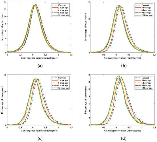 Continuous histogram plot for the rate of change of convergence for 24-h epoch difference with (a) Criteria I, (b) Criteria II, (c) Criteria III, and (d) Criteria IV.