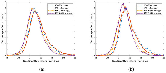 Continuous histogram plot of gradient flux for varying window sizes and time intervals around the region of precipitation, with the smallest area sizes of (a) 4° × 4° and (b) 6° × 6°.
