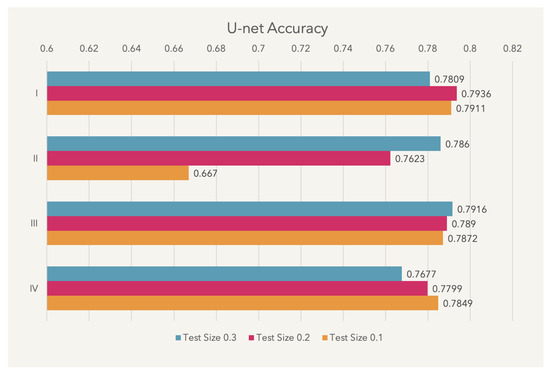 Figure 16 shows the output accuracy of using a U-Net to predict rainfall with different input criteria, as listed in Table 3. It can be clearly observed from the figure that a test size of 10% shows the lowest accuracy, which might occur due to overfitting, whereas the other two cases give almost similar results. The convergence of the gradient provides a high true detection rate, but it may also increase false alarms, as the atmospheric gradient converges toward regions with high moisture content. A smaller test size implies a larger training dataset, which may lead to overfitting and increase the false alarm rate, especially in the absence of PWV, thereby decreasing the overall accuracy of the model. Therefore, we use a test size of 20% for our study, as this increases the amount of training data and makes the model more robust. Maximum accuracy is achieved when all parameters are used as input features to the U-Net model. The accuracy of the predicted output decreases with the exclusion of any of the three inputs. We achieved an accuracy of almost 80% with this proposed U-Net architecture, using all weather parameters as input to the deep learning model.