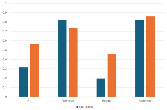 In this section, we incorporate gradient flux instead of gradient convergence along with averaged PWV and gradient magnitude to forecast the rain events over a region in the tropical climatic zone using a deep learning model. This study was performed over a similar geographical region to the prior spatiotemporal analysis of the atmospheric gradient. The various atmospheric parameters are estimated over an area of either 6° × 6° or 8° × 8° to conduct a comparative analysis of prediction accuracy for varying area sizes with different input features in the proposed U-Net model. In this analysis, the weather conditions are binary encoded based on the rainy and non-rainy regions of the specified area size. If a region meets the rainfall condition specified in Section 3.1, it is encoded as 1; otherwise, the respective area is represented as 0 in the labels for the proposed deep learning model. Since the number of non-rainy regions is substantially higher than the number of areas affected by significant rain events, a class weight of 7:2 has been applied to the labels 1 and 0, respectively. The model was trained with 200 epochs followed by validation and testing with respective datasets to accurately predict the region of precipitation. Figure 18 presents the output accuracy of the U-Net model for forecasting regions affected by rainfall using gradient flux, along with gradient magnitude and PWV. The proposed algorithm with gradient flux achieves a satisfactory accuracy of over 80% while predicting the region afflicted by significant rain events in tropical climates. The model provides substantial precision, indicating an improved performance of the U-Net architecture in rainfall prediction over a region. We can clearly observe that the region of 8° × 8° shows greater performance compared to 6° × 6° in terms of accuracy, the F1 score, and recall value. Despite slightly lesser precision for an area of 8° × 8°, the recall value is sufficiently higher than that of the region with an area size of 6° × 6°. A larger recall value, which corresponds to the true prediction of rainy regions, yields greater accuracy for an area size of 8° × 8°. A smaller recall value for an area size of 6° × 6° leads to a reduced true detection of rainy regions, despite having higher precision, which may result from accurately predicting areas without significant rain events. Therefore, the model predicts rainy regions more accurately in larger areas compared to smaller ones. This analysis highlights the importance of gradient flux in forecasting rain events over an area in the tropical region with greater accuracy.