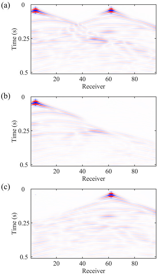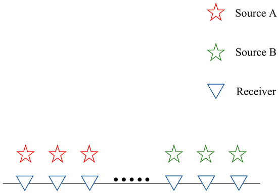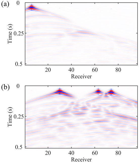 Deep-learning-based deblending techniques can be viewed as denoising methods, where neural networks are employed to suppress blending noise [13]. These approaches typically require converting pseudo-deblended data from the shot domain into another domain. In non-common-shot gathers, the useful signal appears continuous, while blending noise from other seismic sources manifests as random noise [14,15]. As a result, denoising methods based on supervised and self-supervised learning have been introduced to suppress blending noise [16,17,18,19]. However, these methods rely on a pseudo-deblending operation to account for the delay time of source excitation. When the delay time is unavailable, these deblending techniques fail. Wang et al. [20] obtained pseudo-deblended data from other sources via phase shift. However, this approach requires a small distance between adjacent sources, limiting the generalizability of the trained neural network to new datasets.