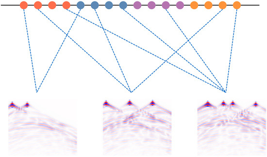 The generation of blended data. The four colored dots indicate seismic sources classified into four groups.