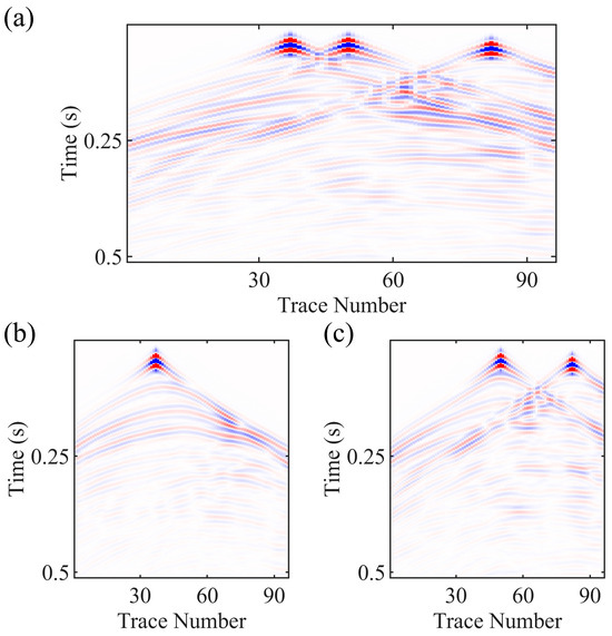 After two iterations, the remaining blending noise contains signals from only two sources. The results of the third iteration are shown in Figure 14. The useful signals from the third and fourth sources are successfully separated. With three iterations, the deblending framework efficiently extracts the useful signals from each source in the blended data individually. The useful signals are recovered with high quality during the deblending process. The effects caused by the blending noise are basically eliminated, which fully demonstrates the powerful ability of this iterative deblending framework in solving the complex blended seismic data problem.