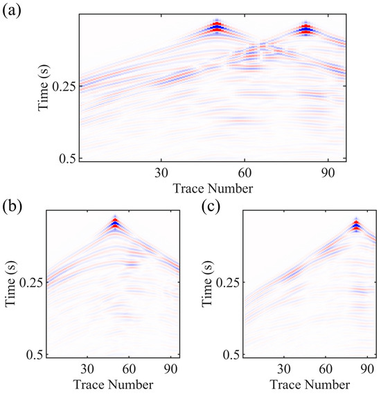 The trained WNETR is embedded in an iterative framework for deblending, as shown in Figure 8. The number of iterations must be predetermined based on the degree of blending. In each iteration, the network generates three outputs: the first is the deblending result for the first source, the second is the blending noise, and the third is the reconstructed blended data, which aids in WNETR’s training. However, the iterative framework utilizes only the first two outputs. Rather than using the first output directly as the deblending result, we combine the first and second outputs to obtain the final deblending result: