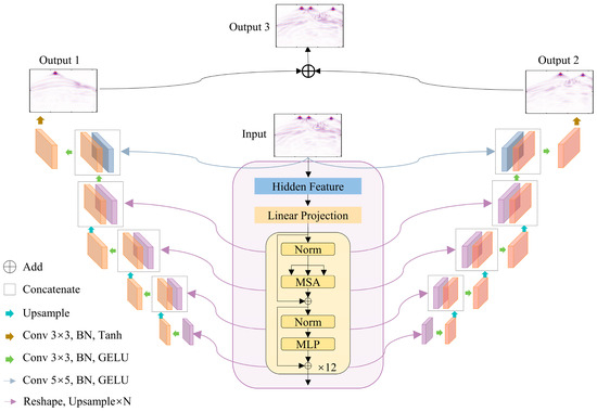 We propose the WNETR to directly separate blended seismic data. WNETR is inspired by the UNETR architecture [35]. UNETR, which combines the advantages of Transformer and U-Net [36], has demonstrated significant success in medical image segmentation tasks. The architecture of WNETR is shown in Figure 7. It contains one encoder and two decoders. The encoder extracts features from the blended data using both Transformer and CNN techniques. The two decoders are responsible for predicting the useful signal and blending noise, respectively. Additionally, the sum of the two outputs is designed to be consistent with the original blended data.