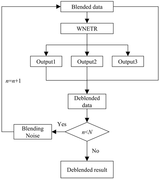 where is the deblending result for iteration number , is the input data of the WNETR, is the first output of the WNETR, and is the second output of the WNETR.