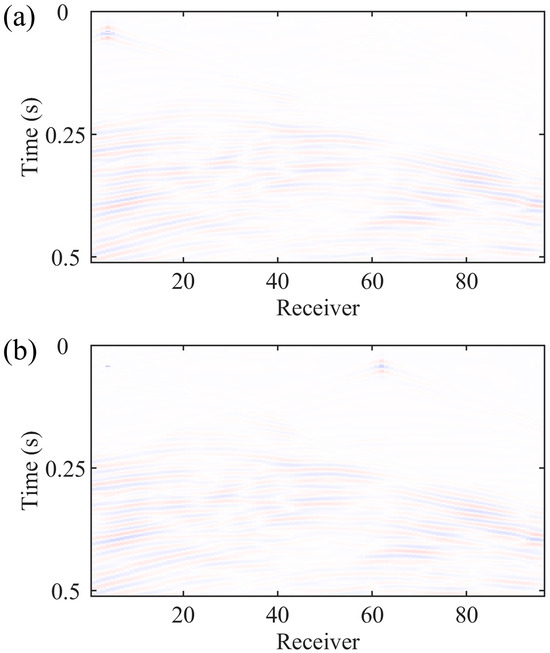 The blended data with a mixing degree of 4 are shown in Figure 11. A higher degree of mixing implies that there are more complex interactions between the seismic sources, increasing the difficulty of the deblending task. To address this, we employ an ordered deblending strategy. Specifically, the deblending operation is performed sequentially on the blended data in a left-to-right direction, and this order of deblending is determined by the training labels. In the iterative process, WNETR first processes the leftmost useful signals, and then separates the signals from different seismic sources one by one. Figure 12 shows the first two outputs of the first iteration. They represent the useful signal of the first source and the blending noise generated by the other seismic sources, respectively. Despite the complexity of blended data, the useful signal from the first source has been successfully separated through the first iteration. The blending noise in Figure 12b still contains the useful signals from other seismic sources, which are used as input for the second iteration. This input excludes the useful signals separated in the previous iteration. Since the useful signals of the first source have been successfully separated, the signal of the second source is located on the leftmost side. Figure 13 shows the deblending results and blending noise from the second iteration.