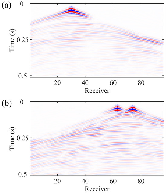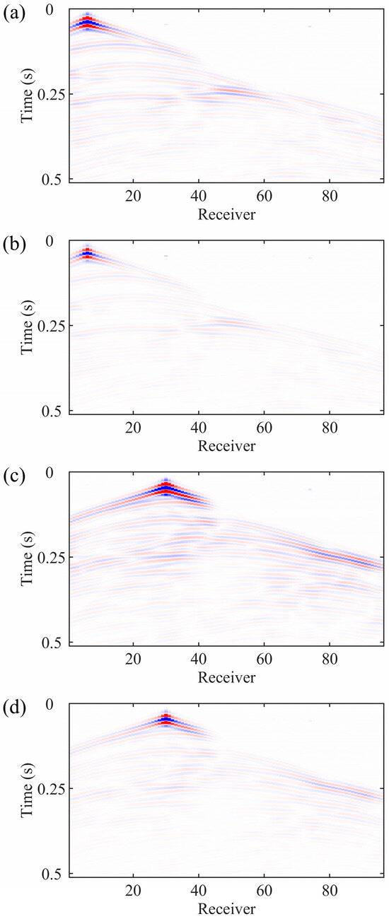 Figure 6 displays blended data containing two sources, where label 1 corresponds to the useful signal of one source, and label 2 represents the useful signal of the other source. We first generate 300 blended data containing two sources, three sources, and four sources on each velocity model. The blended data with four sources can be successively separated into blended data with three and two sources. Similarly, the blended data with three sources can be successively separated into blended data with two sources. Thus, we obtain a total of 9000 training data, which include 1500 four-source data, 3000 three-source data, and 4500 two-source data.