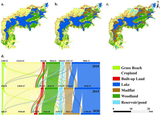 Landscape type distribution of Shengjin Lake Reserve. (a) 2010; (b) 2015; (c) 2020; and (d) landscape area change and transfer of each year.