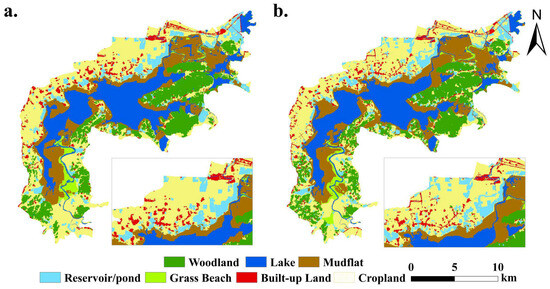 During the classification process, the automated classification results can still be influenced by factors such as sensor resolution, lighting conditions, and atmospheric environment, leading to confusion or misclassification of certain landscape types. Therefore, during field surveys, we collected sample data from different landscape types and compared them with corresponding high-resolution remote sensing images. Through visual interpretation, misclassified areas were manually corrected. For example, some mudflats or grasslands may have been mistakenly classified as water bodies or croplands in the automated classification, and we manually adjusted these areas based on field observation data and high-resolution imagery. In this study, we surveyed a total of 150 field plots, stratified by the seven landscape types within the reserve to ensure full representation of each type. These plots were evenly distributed across different areas of the reserve, covering the seven main landscape types (lakes, mudflats, grass beach, cropland, built-up land, woodland, reservoirs/ponds). We ensured that each landscape type had at least 20 sample plots to provide sufficient data for classification corrections and accuracy assessment. The final kappa coefficient exceeded 90%.