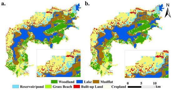Under the ecological protection scenario (Figure 7c,f), lakes and grass beaches will increase by 1.05% and 0.64% (Table 6), respectively, indicating the effective protection of grass beaches and lakes under this scenario. The expansion of built-up land and reservoirs/ponds will be minimal, increasing by 0.43% and 1.56% (Table 6), respectively. The mudflats proportion will decrease by 1.62%, while that of woodlands will expand by 2.51% (Table 6). Our results show that the ecological protection scenario can effectively guarantee ecological land and plays an important role in maintaining wetland resources in the reserve.