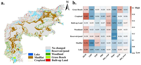 Table S1 shows the dynamic transitions among landscape types in the reserve from 2010 to 2020. During this period, landscape transitions were primarily between mudflats and lakes, as well as between croplands and reservoirs/ponds. The increase in mudflat area was particularly obvious, which was mainly derived from lakes (75%) and grass beaches (16.69%). Mudflats also served as the main transfer direction for lakes and grass beaches, with a transfer rate from grass beaches to mudflats as high as 88.34%. The area transferred into reservoirs/ponds reached 1710.158 hectares, which was predominantly converted from cropland. Simultaneously, built-up land expanded rapidly and was mainly converted from cropland (80.36%) and woodland (11.04%).