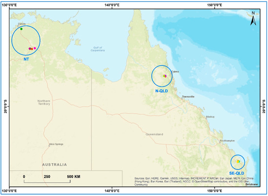 RF-based location (region) prediction of fruit count in the (a) Northern Territory (NT), (b) Northern Queensland (N–QLD) and (c) South East Queensland (SE–QLD). The different coloured points represent the sampled trees on a given farm in the respective regions.