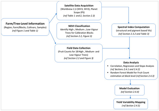 Over the past few decades, the yield of mango (Mangifera indica L.), one of the most important fruit crops with global recognition due to its nutritional benefits and economic value, has been on the rise [1]. Mango yield is influenced by a range of factors, including soil quality, weather (i.e., rainfall and temperature) and management practices, among others [2,3,4]. Accurate mango yield prediction promotes the efficient use of farm inputs and resources such as irrigation, fertiliser, labour and machinery [5,6]. Additionally, with an understanding of the spatial variability in yield across a farm (trees and blocks), growers are able to optimise production by implementing site-specific management programmes on the farms. This is the essence of the concept of precision agriculture, which aims at providing support for growers to apply the right amount of input at the right time in the right place (i.e., per tree or management zone) [7]. Thus, the ability to accurately estimate mango yield in a timely manner at varying scales is crucial for effective agricultural planning and resource allocation [5,6]. This also help growers in planning harvesting logistics (labour, transport, storage and processing requirements) and total production estimates to support forward selling [8,9,10].