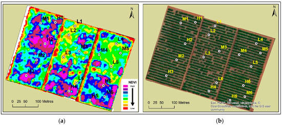 Example of 18 tree locations on the classified NDVI map (a) and on the ESRI basemap image (b). The points with L, M and H prefixes represent the different tree vigour classes of low, medium and high, respectively.