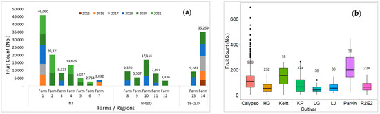 The NT had the highest number of farms and datapoints. Farm 1 contributed the highest number of trees sampled (432) and fruits counted (46,090), followed by Farm 14 with 270 sampled trees and 35,259 fruits counted across the six-year period. The least number of trees sampled and fruits counted was found on Farms 5 and 12 with 36 trees each and respective fruit counts as shown in Figure 4a. While majority of the cultivars planted produced median number of fruits below 100, Calypso, Keitt and Parvin produced median fruit counts above 100 fruits/tree (Figure 4b).